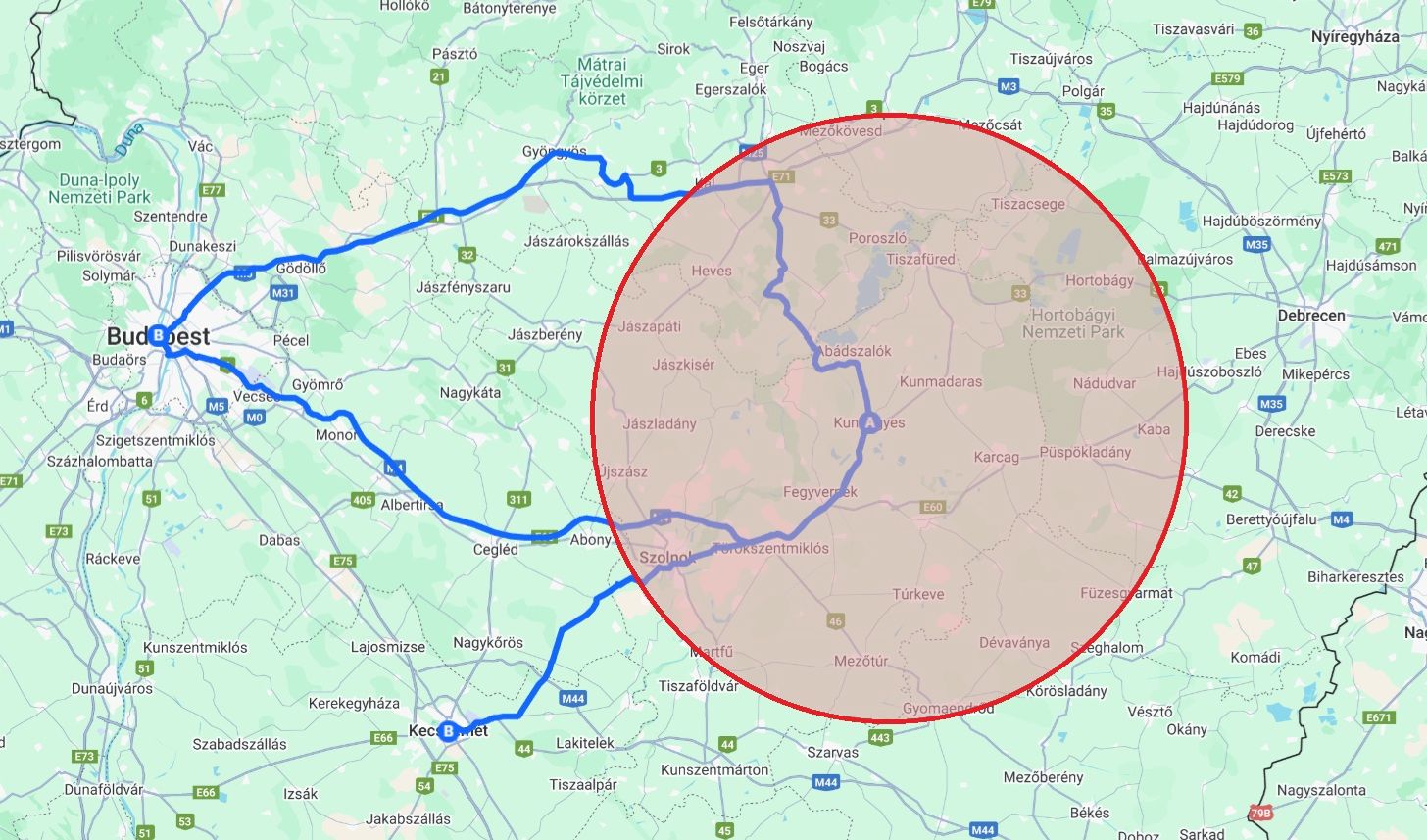 - Kunhegyes 50 km-es körzete.